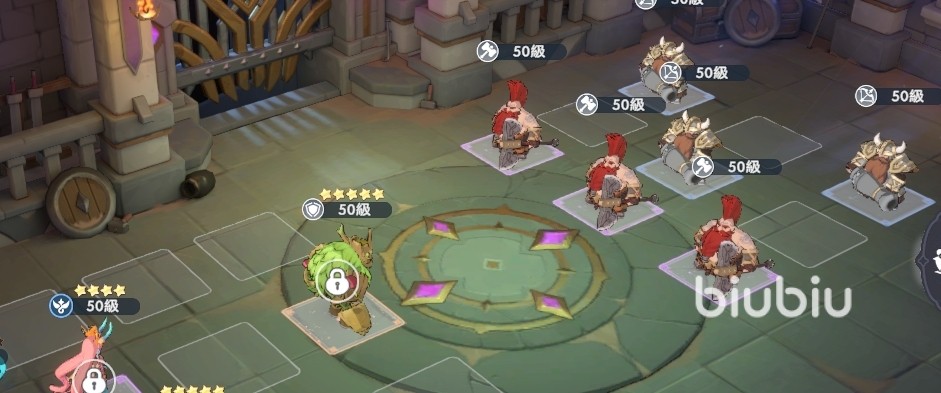 第五关,猫娘作为刺客切后排,开始的时候可以布置在右边位置,便于绕过前排哥布林,直接就切人马投矛手,通过大招机制来不断刷新技能CD,搭配蛇魔的控制,能实现高效收割。