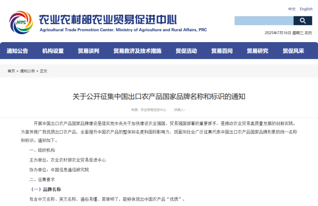 最高奖金3万元!农业农村部贸促中心公开征集中国出口农产品国家品牌名称和标识_南方+_南方plus近日,农业农村部农业贸易促进中心发布《关于公开征集中国出口农产品国家品牌名称和标识的通知》以下简称《通知2025-12-18
