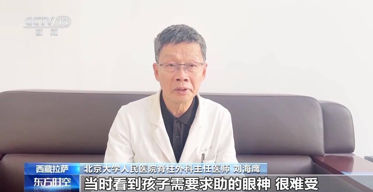 北京大学人民医院脊柱外科主任医师 刘海鹰:三年前见到贡桑的时候,七八月份了天还热着,穿着一个大棉袄,把后面那么大一个“驼峰”稍微遮掩一点,当时看到孩子需要求助的眼神,很难受。