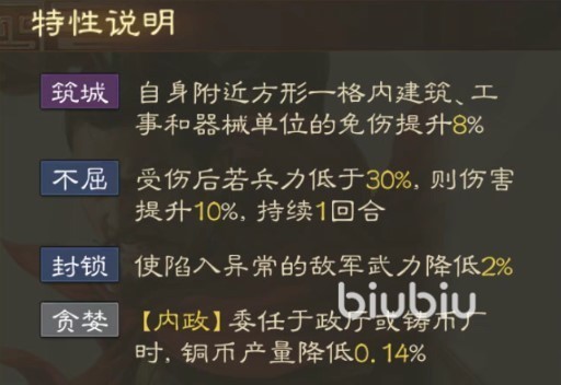 那么角色的技能以外,每个人物都会有不同的特性,其中这个角色的是可以对己方一格范围内的建筑设施提升一定的免伤效果。而在角色进入负面状态的时候,那么对方的武力值就会下降两个百分点。