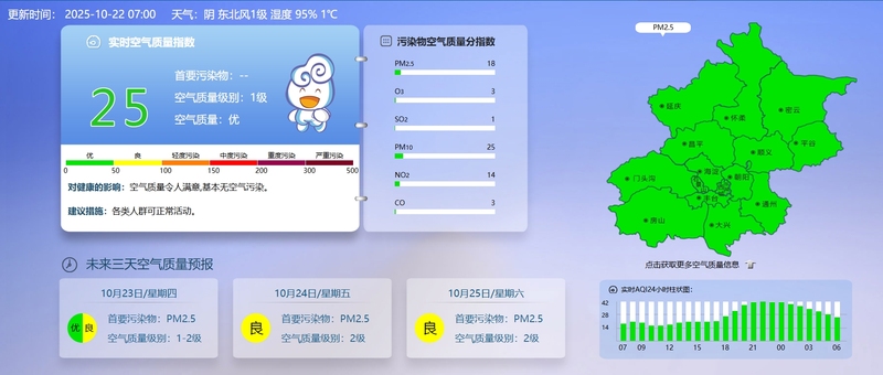 据北京市生态环境监测中心今早7时数据,目前实时空气质量指数25,空气质量优。