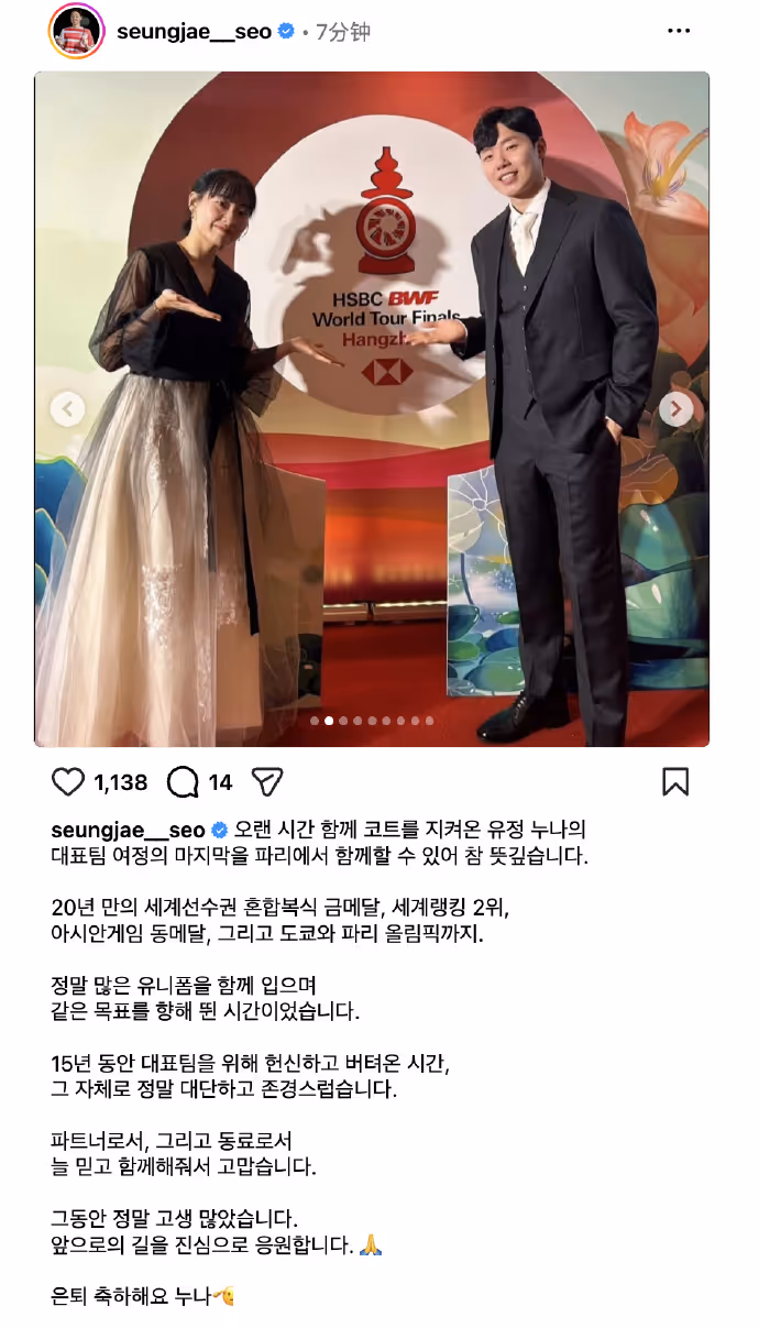 徐承宰发文祝贺蔡侑玎退役:意义非凡