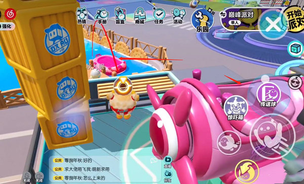 1、蛋仔手中拿好传送道具,派对往高处抛过去,传送这样传送门就会在高处了。门传