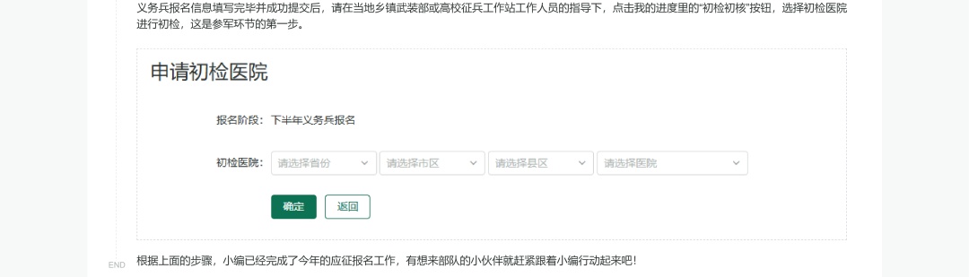 義務兵報名信息填寫完畢并成功提交后,請在當地鄉鎮武裝部或高校征兵工作站工作人員的指導下,點擊我的進度里的“初检初核”按鈕,選擇初檢醫院進行初檢。