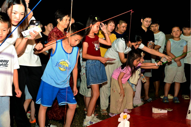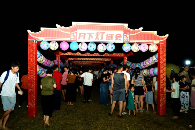 一旁的“游戏挑战营”也是人气爆棚。“中秋诗词飞花令”,围绕“月”“思”“团圆”等关键字,参与者你来我往、佳句频出,展现了游客群众们深厚的文化素养。“功夫筷子夹月饼”“玉兔拔萝卜”“中秋套圈乐”等趣味游戏区亦排起了长队,无论是孩子还是大人,都全神贯注、各显神通,在月下草坪的竞技中感受着节日的氛围。