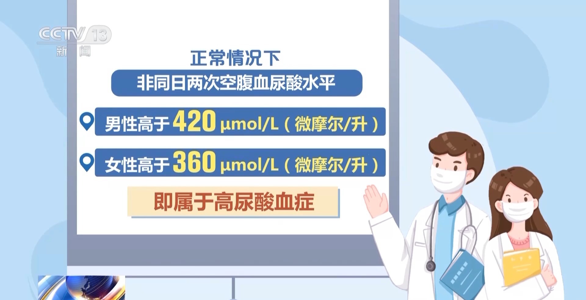 正常情况下,非同日两次空腹血尿酸水平,男性高于420μmol/L(微摩尔/升),女性高于360μmol/L(微摩尔/升),即属于高尿酸血症。