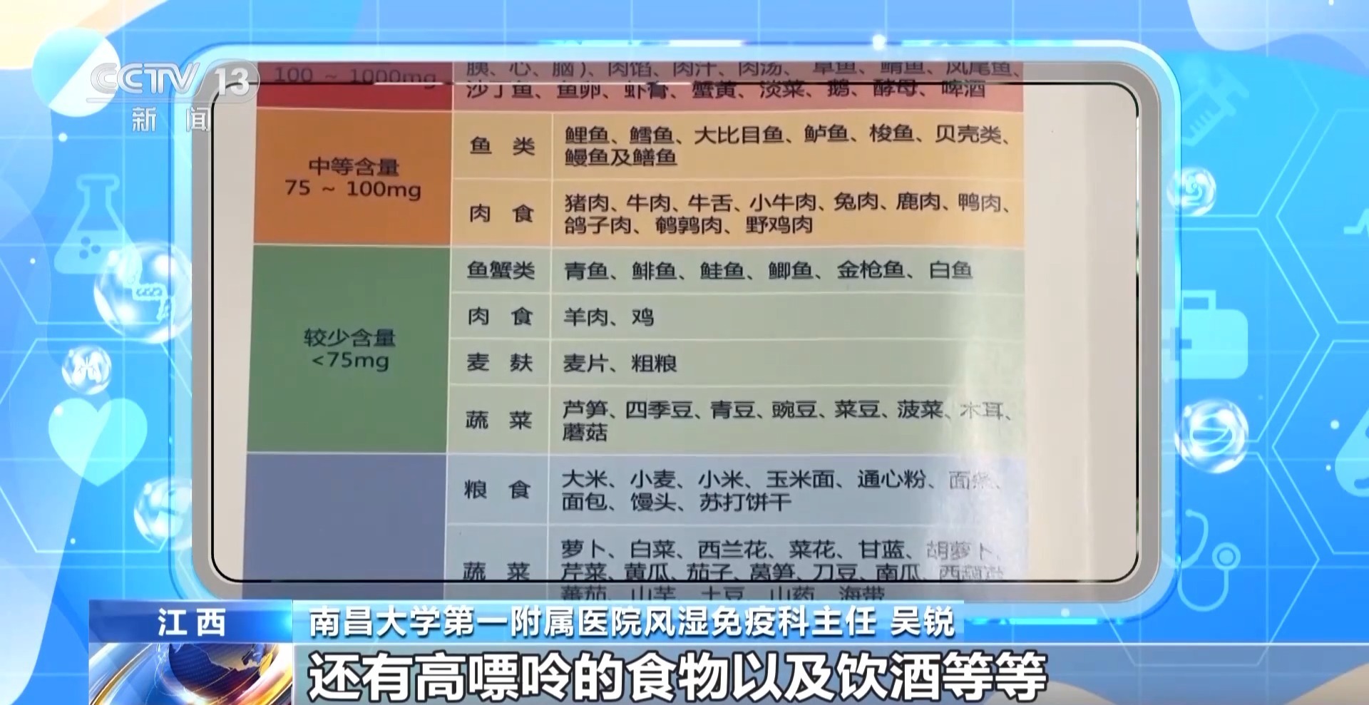南昌大学第一附属医院风湿免疫科主任 吴锐:喜欢含果糖的饮料,还有高嘌呤的食物以及饮酒等等,这些都会导致尿酸生成过多。因为尿酸主要还是一个嘌呤代谢的产物,我们体内的嘌呤在细胞里面是非常丰富的。另外饮食里面尤其是肉类、鱼类的嘌呤也是很多。如果代谢障碍,排泄障碍也会高尿酸,吃得过多它也会高。