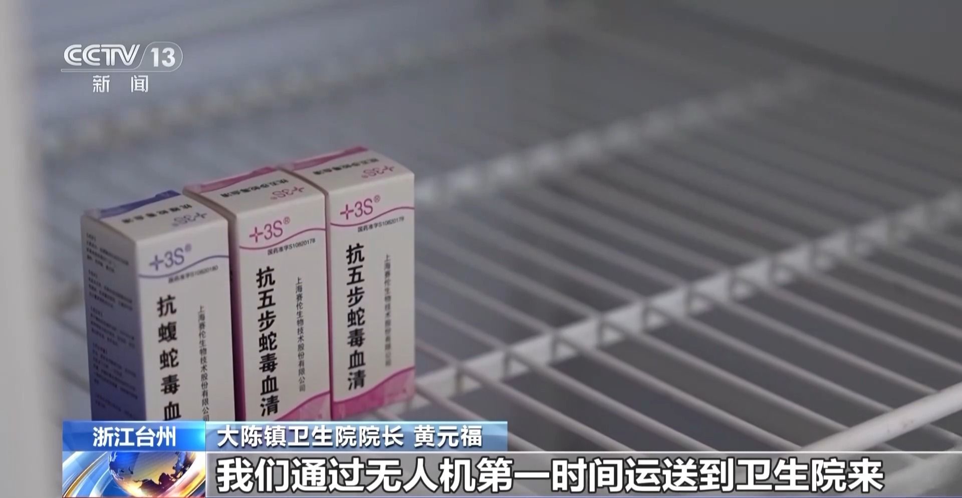 大陈镇卫生院院长 黄元福:像这些蛇抗毒血清,还有一些疫苗,我们通过无人机第一时间运送到卫生院来,为紧急病人的救治争取了宝贵时间。