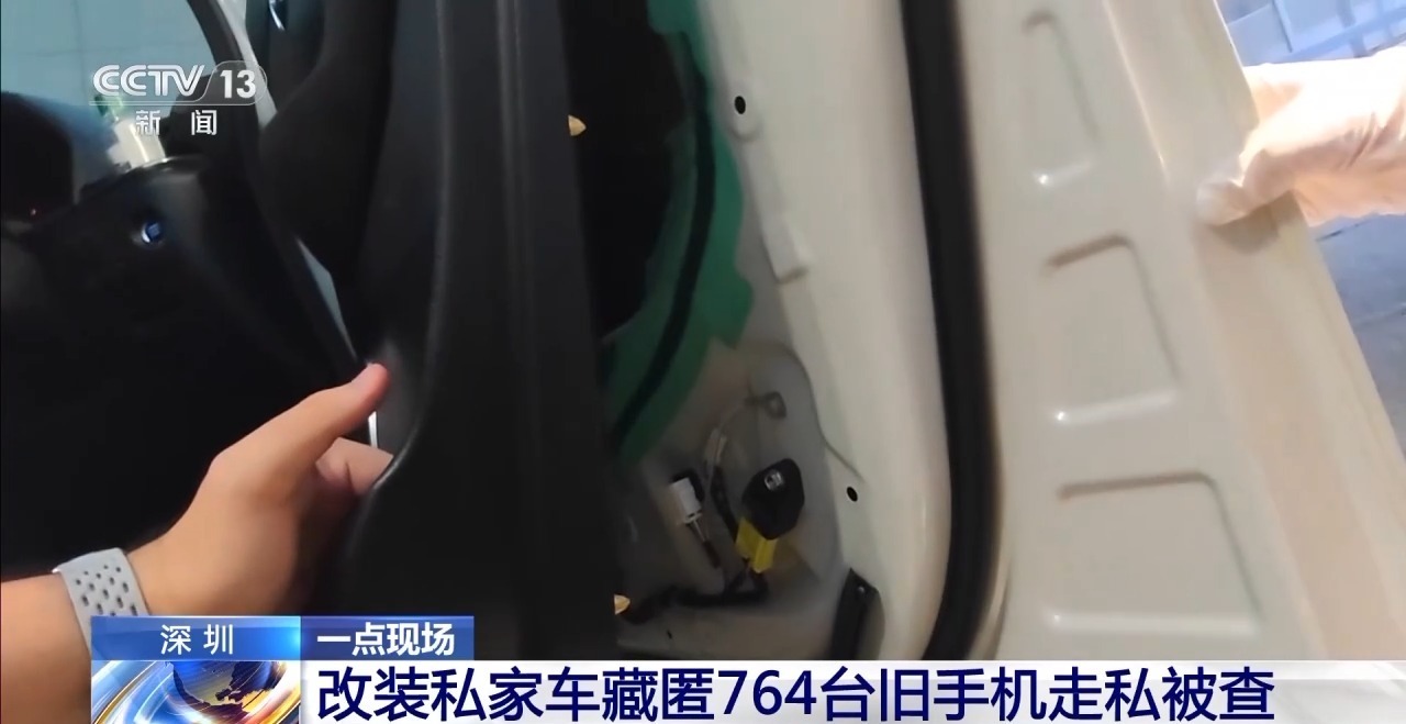 深圳海关所属莲塘海关旅检六科三级主办 唐嘉睿:我们分别在两扇车门的夹层和储物格下方的改装空间中发现藏有大量用透明塑料袋装着的旧手机,每袋均装有2台,共查获旧手机764台。经问询,该车司机受他人委托,帮其带货进境并收取“带工费”。